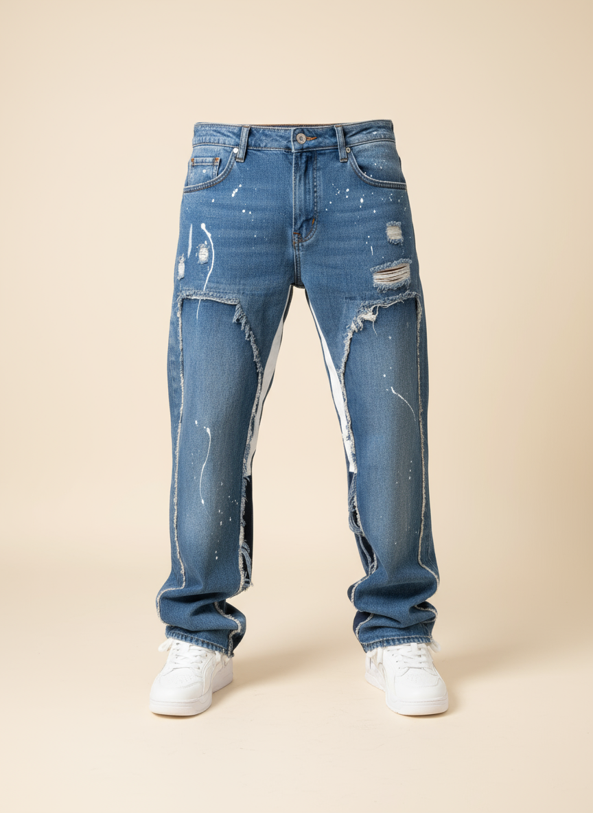 ג׳ינס כחול לגבר עם קרעים מודגשים ועיטורי התזה לבנה בעבודת יד. עיצוב ייחודי עם מראה משופשף ותחושת וינטג׳ עדכנית. גזרה רחבה ונוחה, מושלמת ללוק סטריט נועז עם אופי.