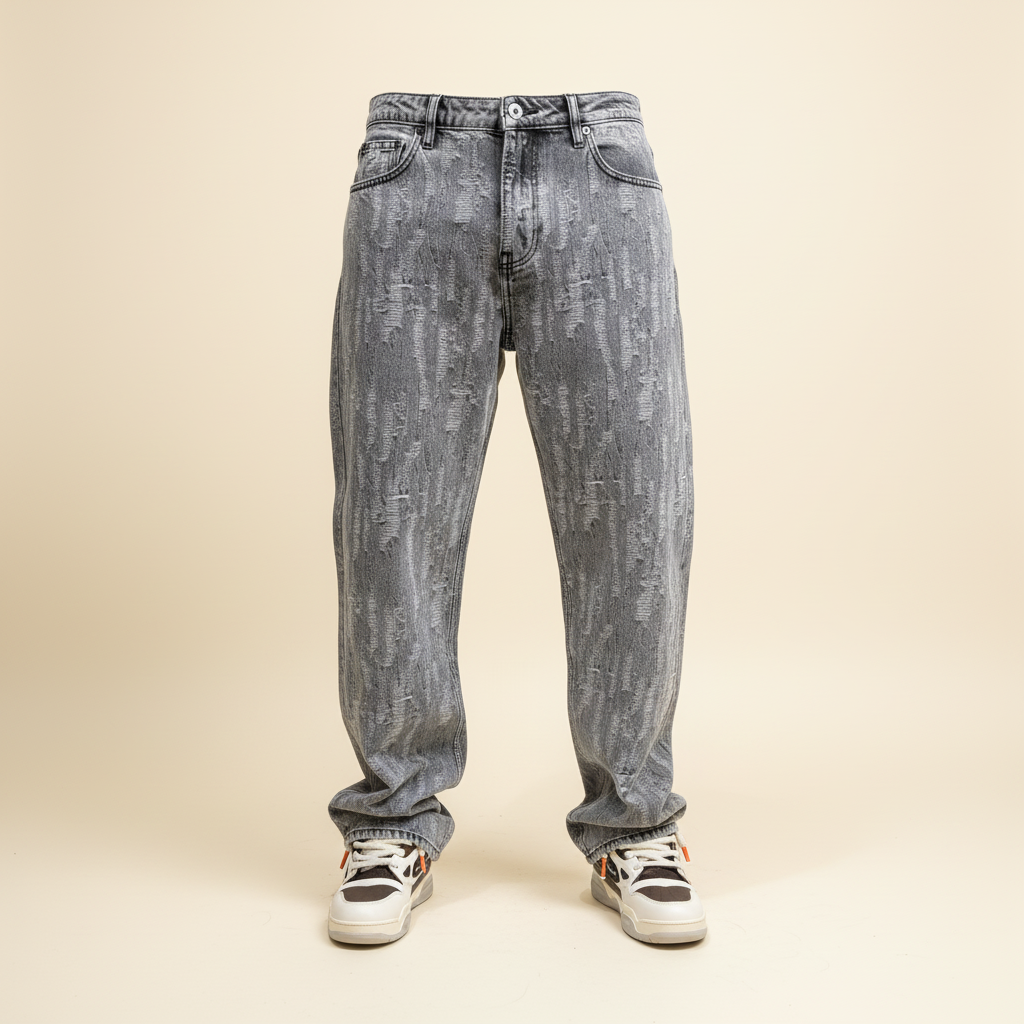 ג׳ינס אפור לגבר בגזרה רחבה – טקסטורת וינטג׳ מודרנית