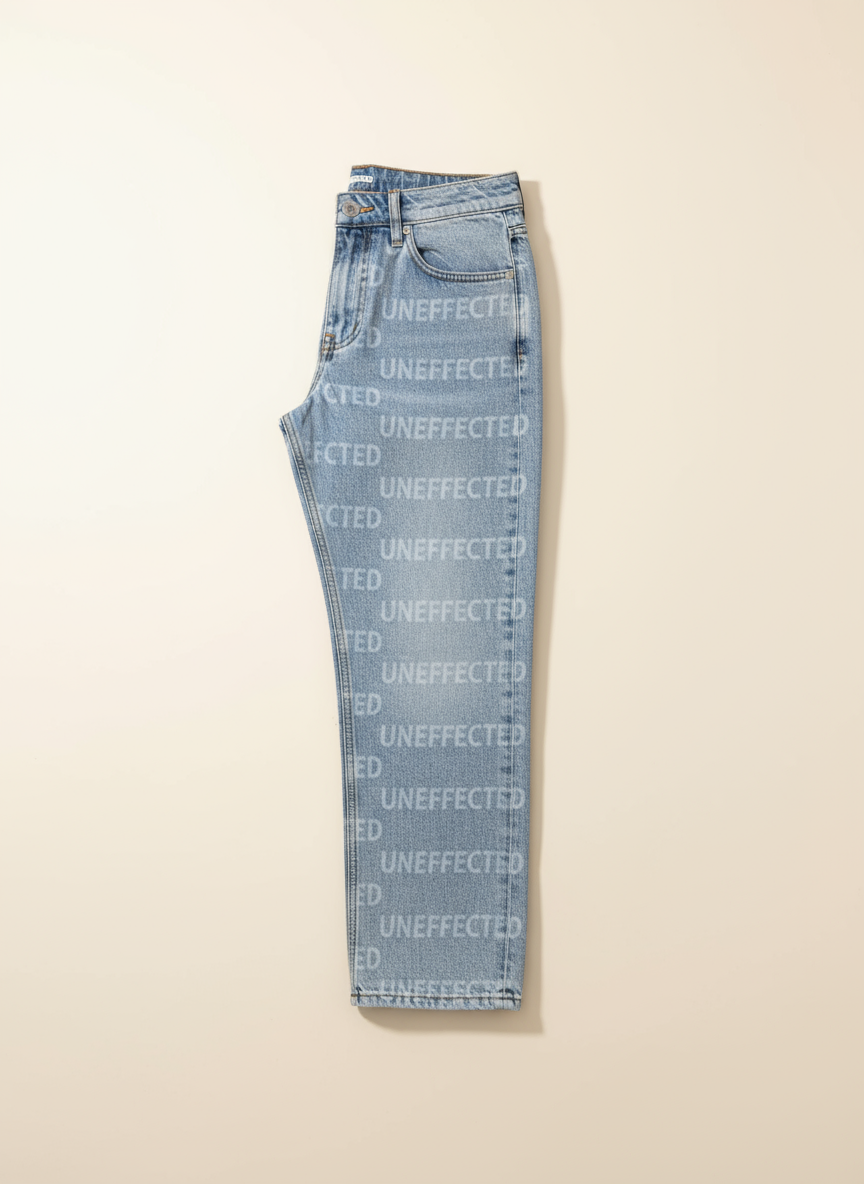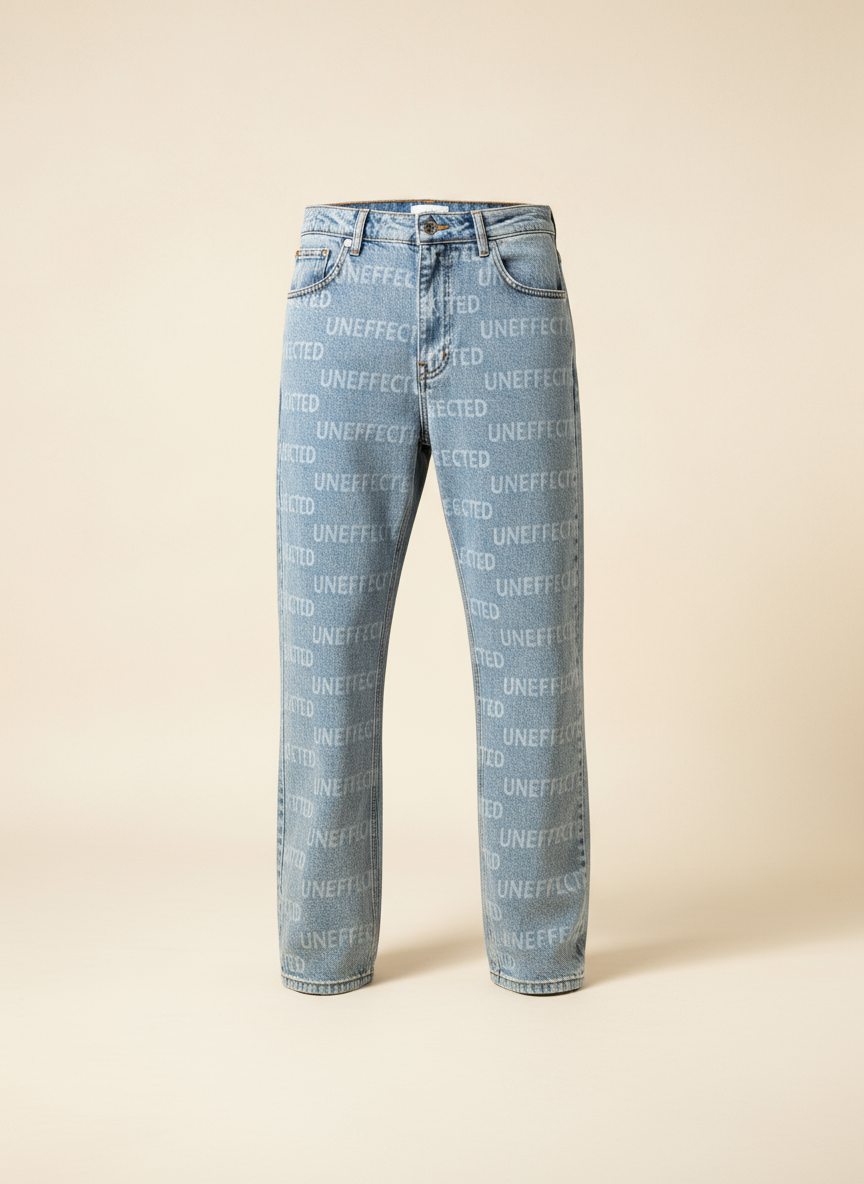 ג׳ינס תכלת לגבר בעיצוב מודרני עם הדפס חוזר של המילה “UNEFFECTED” לכל האורך. גזרה ישרה ונוחה, בד דנים איכותי בעובי בינוני – מושלם ללוק סטריט ייחודי עם אמירה.