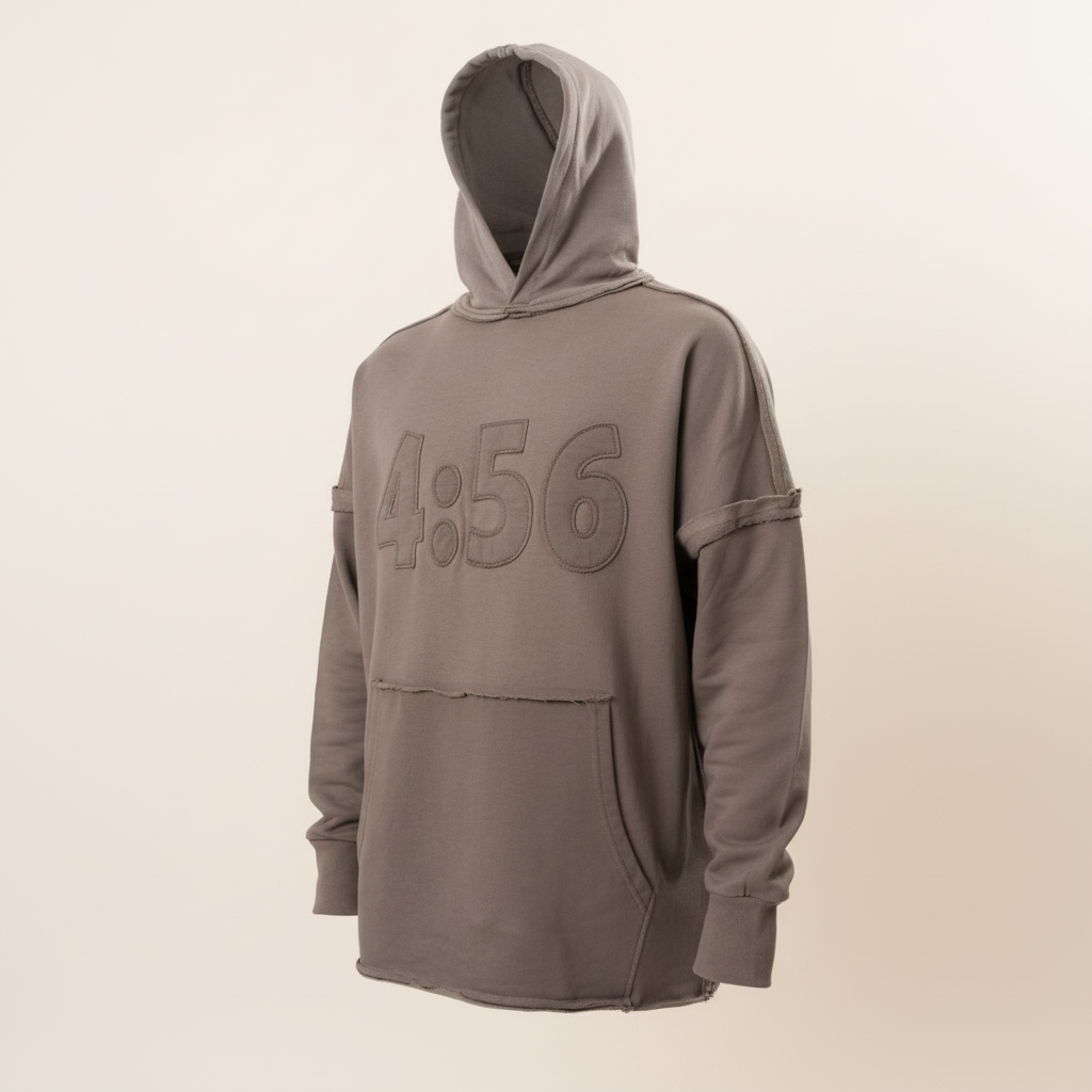 קפוצ׳ון אפור לגבר עם רקמת המספר הבולטת 4:56 בחזית. עיצוב ייחודי עם גימורים פרומים ותפרים גולמיים למראה רחוב עדכני וייחודי. עשוי מבד פליז עבה ורך לנוחות מקסימלית וסטייל נינוח.